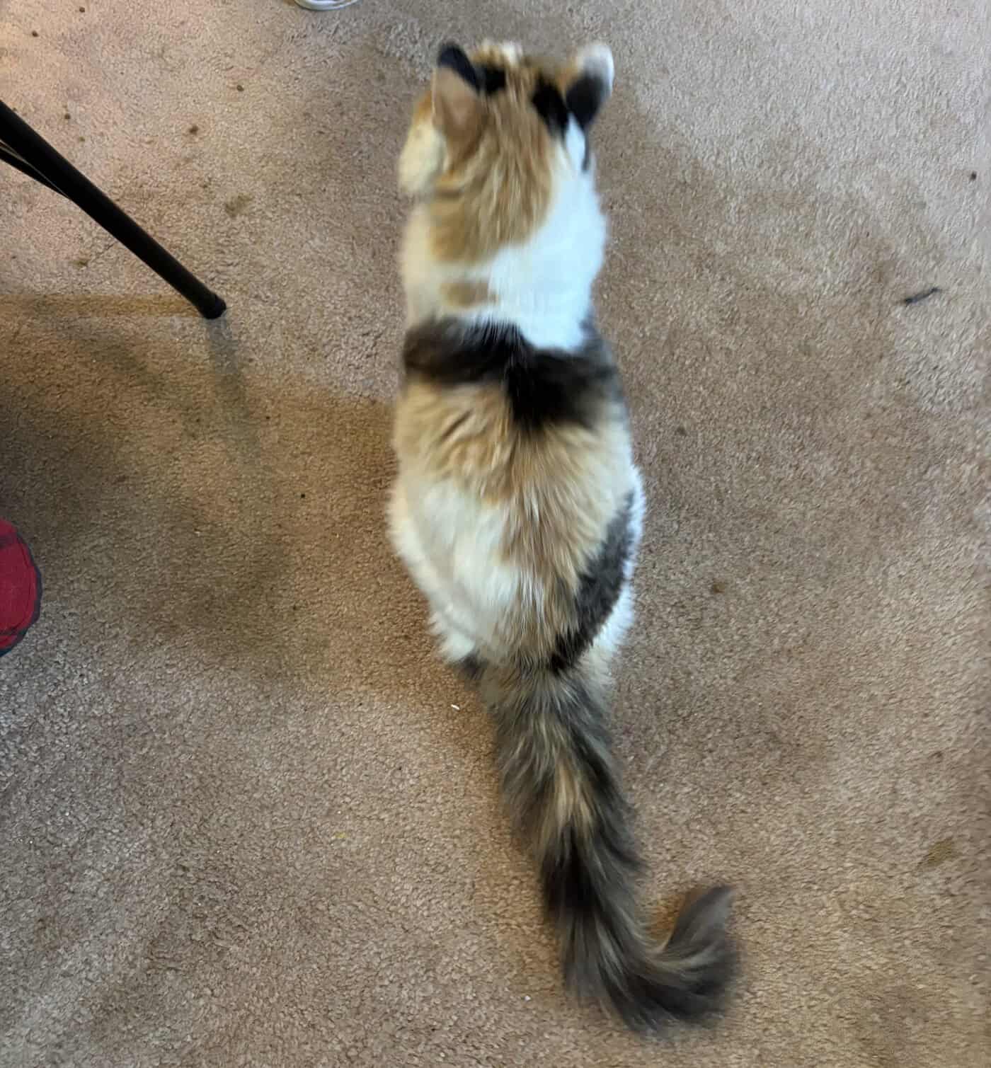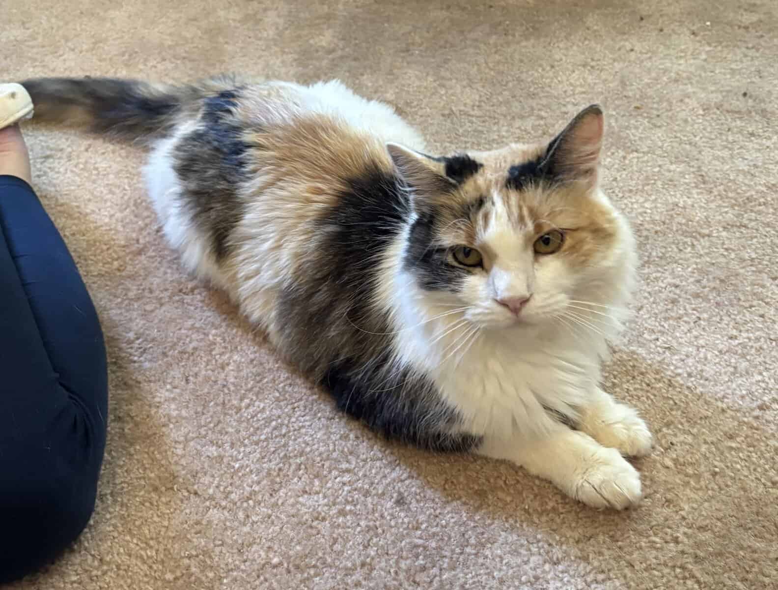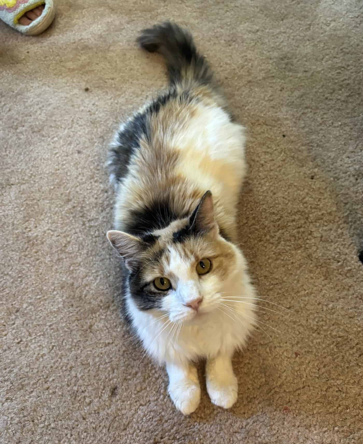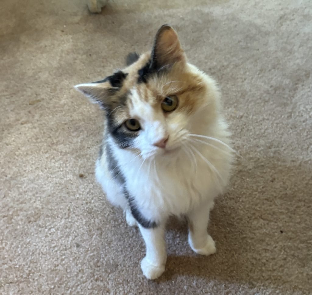We believe Daisy is about 4 years old. She finds laps to be very comfy, and would do best as a single cat or with one other laid-back cat.