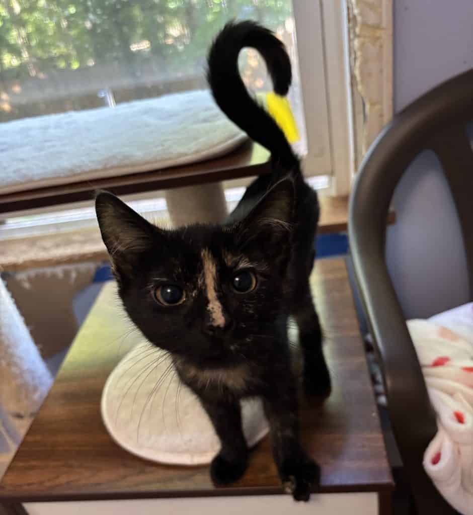 I’m Lacey! I’m a 5 month old tortie girl. I have a sweet and loving nature. I was living in a hotel room with a bunch of other cats when someone rescued me. I It would be great to be adopted with my sister Macy!