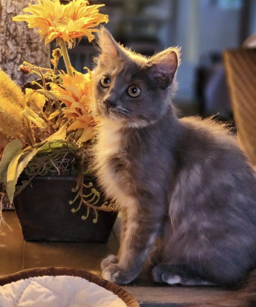 Luna could not be any sweeter! And so beautiful with fluffy gray fur with touches of white. She has a gentle demeanor, but with a playful side.