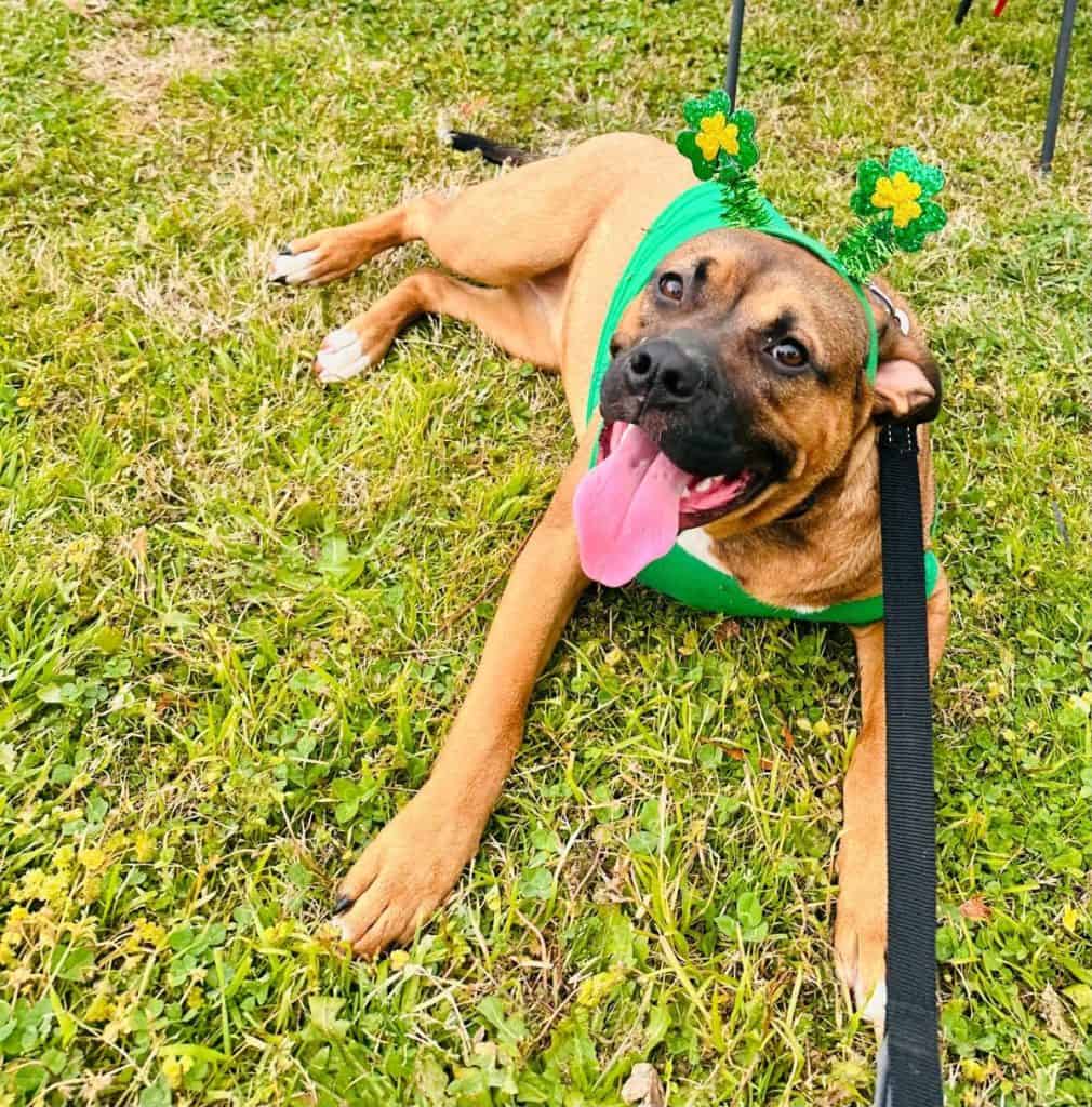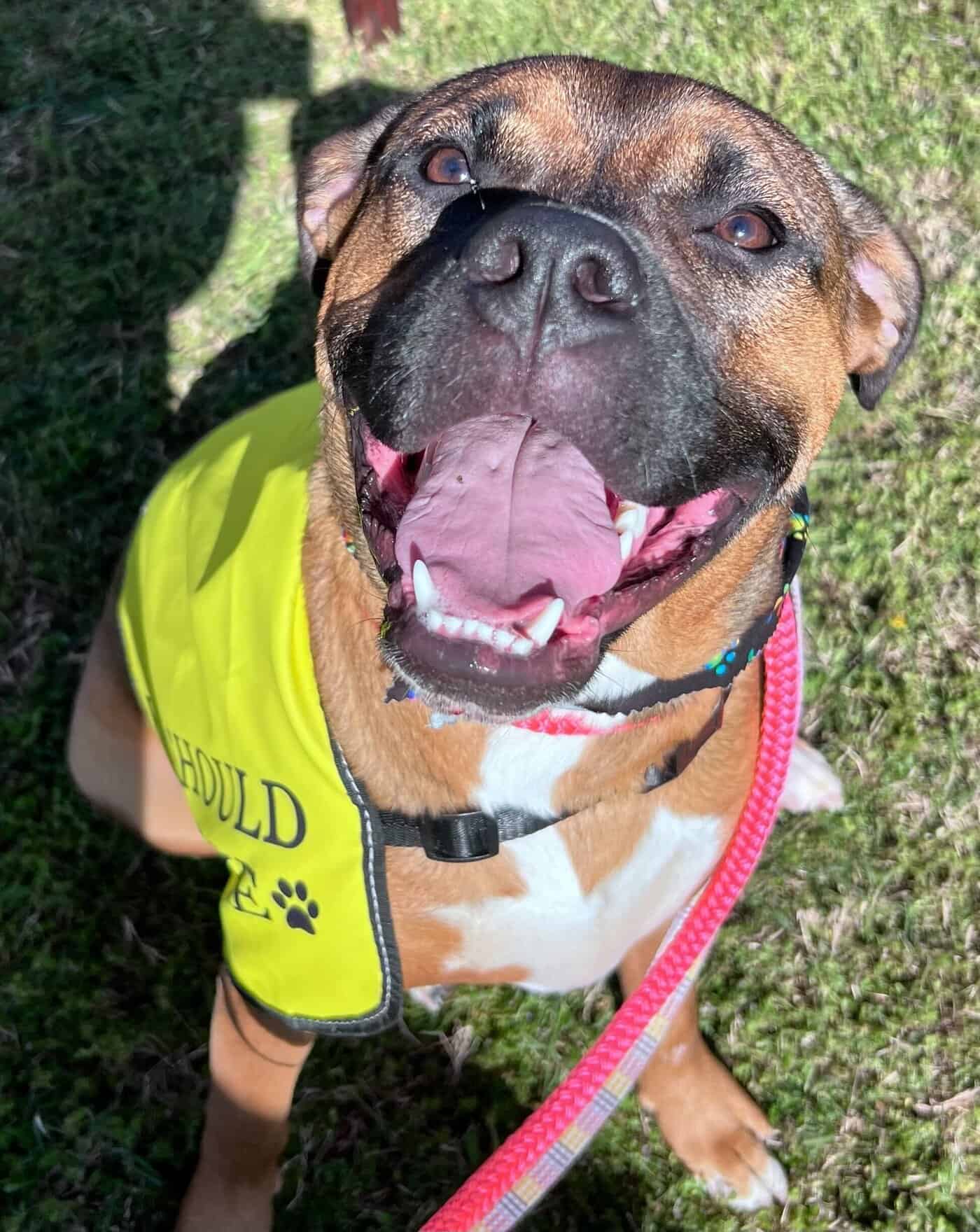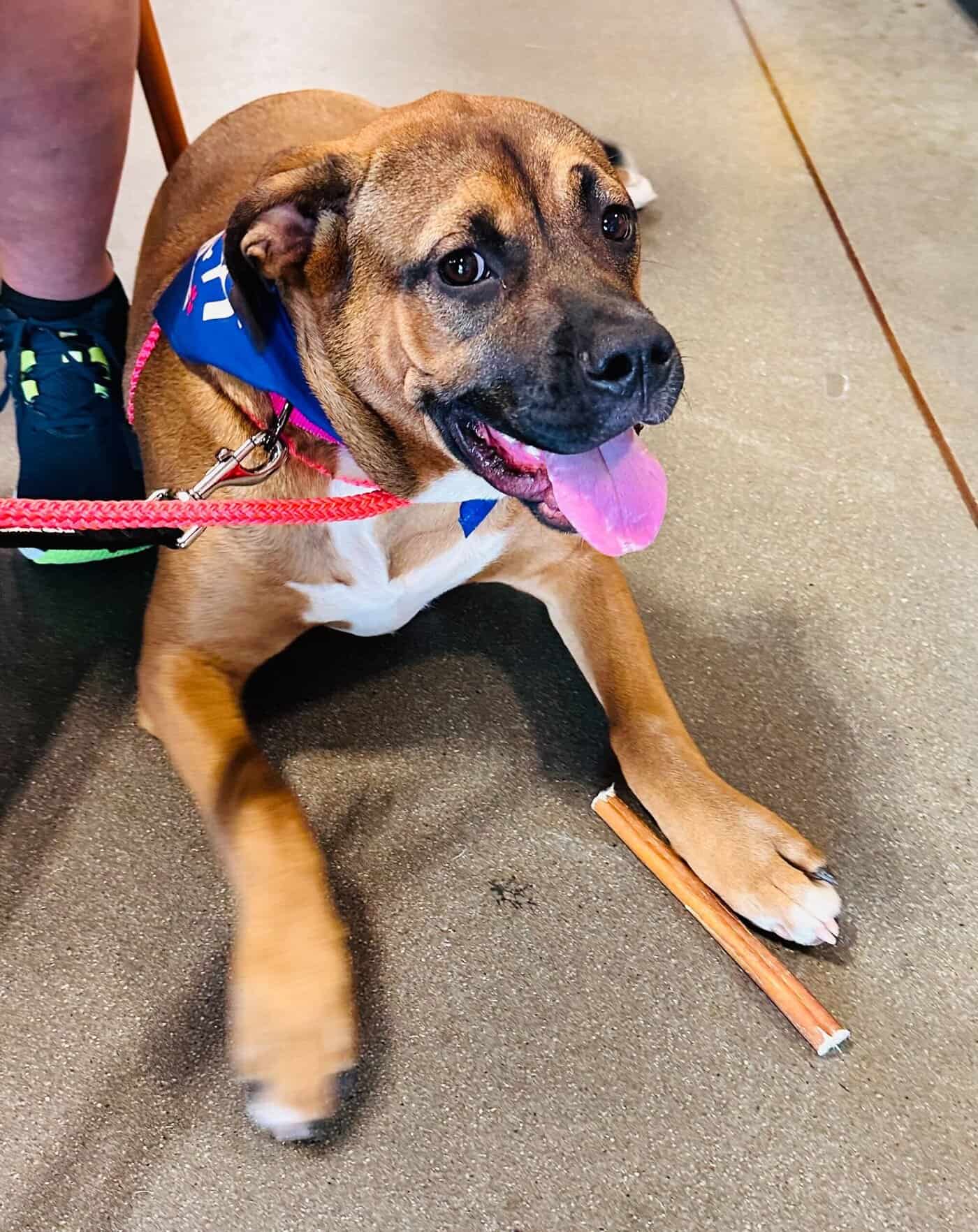 Maple is a 10-month-old (as of May 2025) mixed breed pup with a little bit of boxer in her genes—and an adorable underbite to prove it! At 66 pounds, she’s the perfect mix of playful energy and cuddly sweetness.