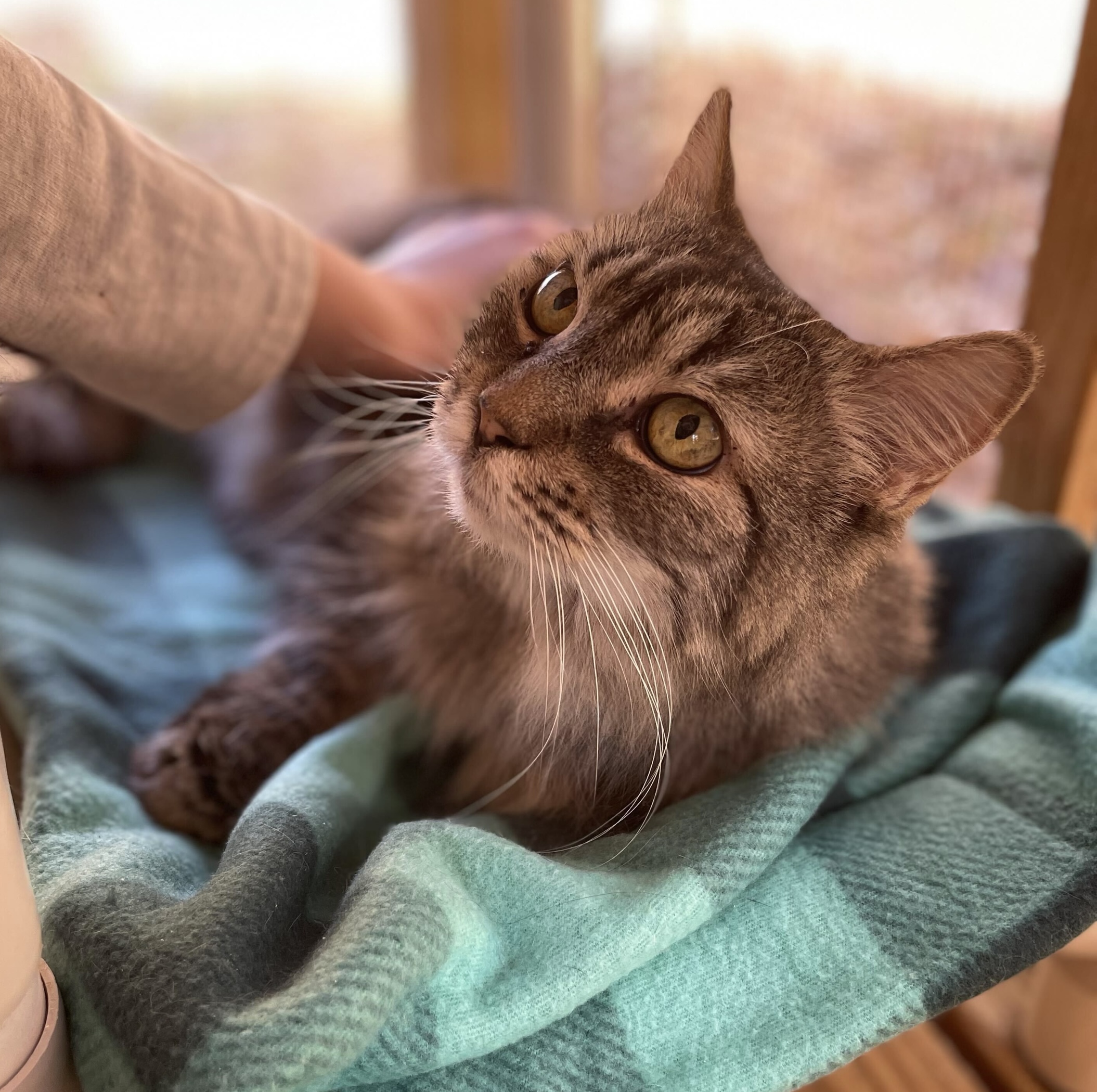 This beautiful girl gets along well with other cats, and we sometimes find her snuggling with them.