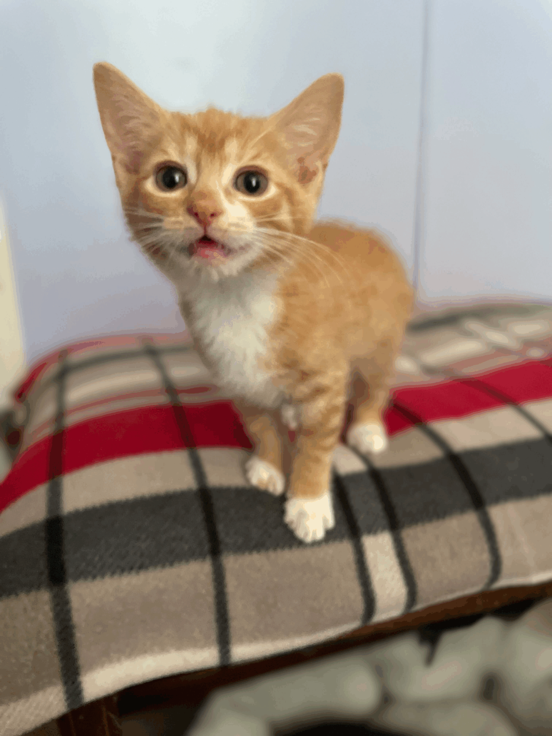 Peaches is sweet, playful, and simply adorable! She was the only surviving kitten in her litter, born outside. She has been in foster care since she was two weeks old and has flourished. She is about 7 wks old as 9-1-25 and will be spayed in mid September.