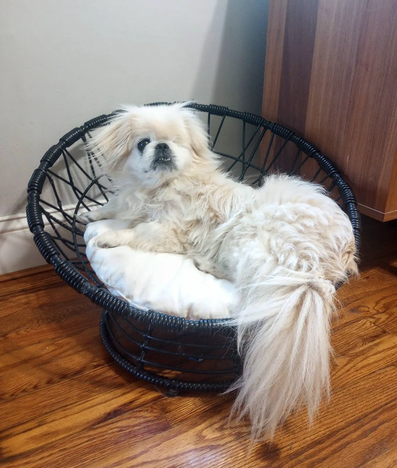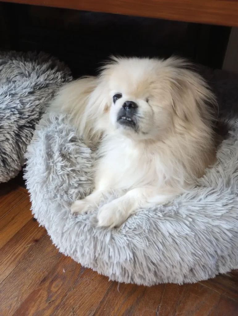 Approximately five or six years old. He has limited sight in his one eye that remains. He is dog friendly and house trained. Despite his limited vision, he gets around well, but does need help going down steps. His owner passed away and he was taken to a local shelter.