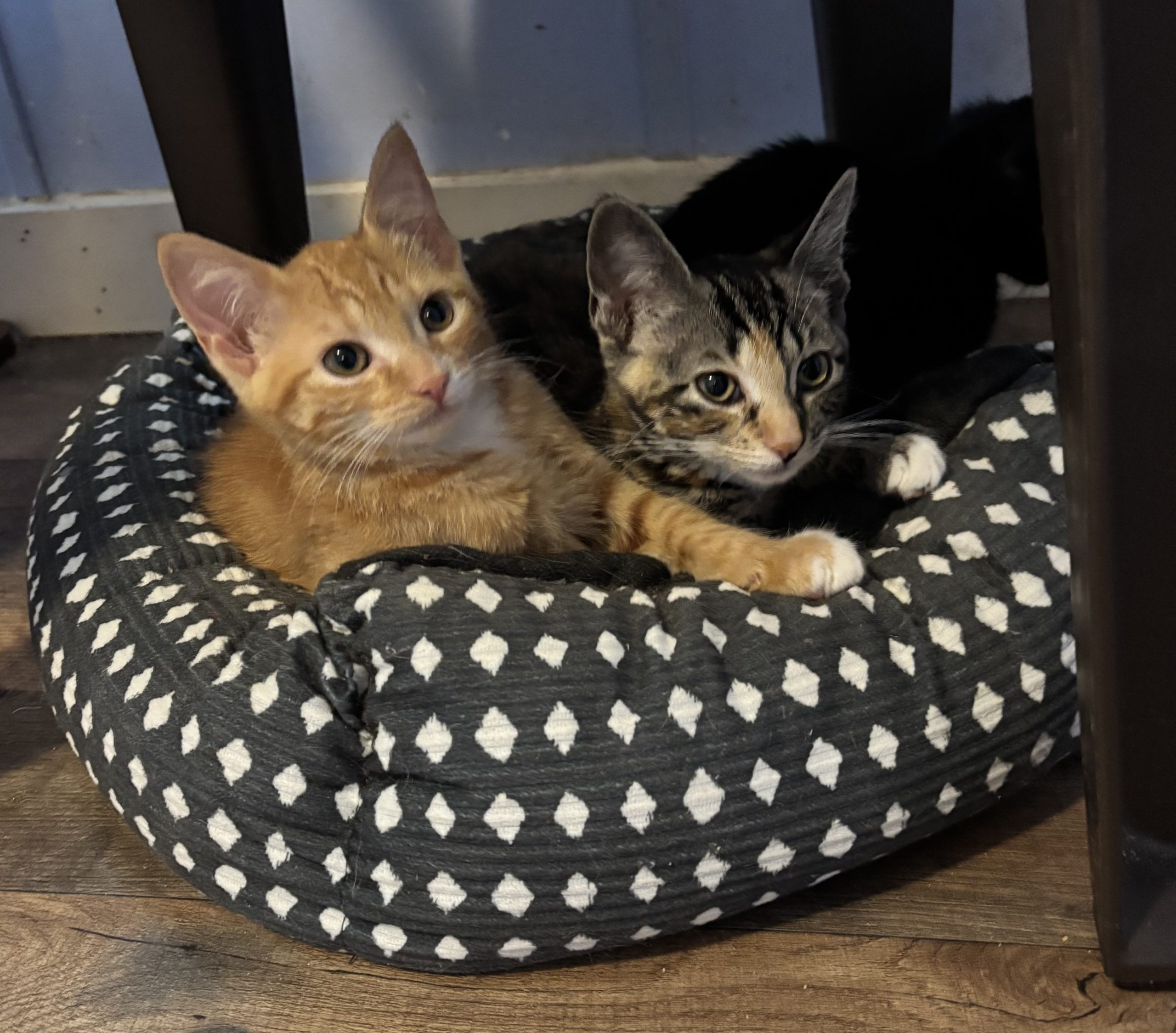 If you’re looking to adopt two kittens, her brother Theo (orange and white) would be a great choice!