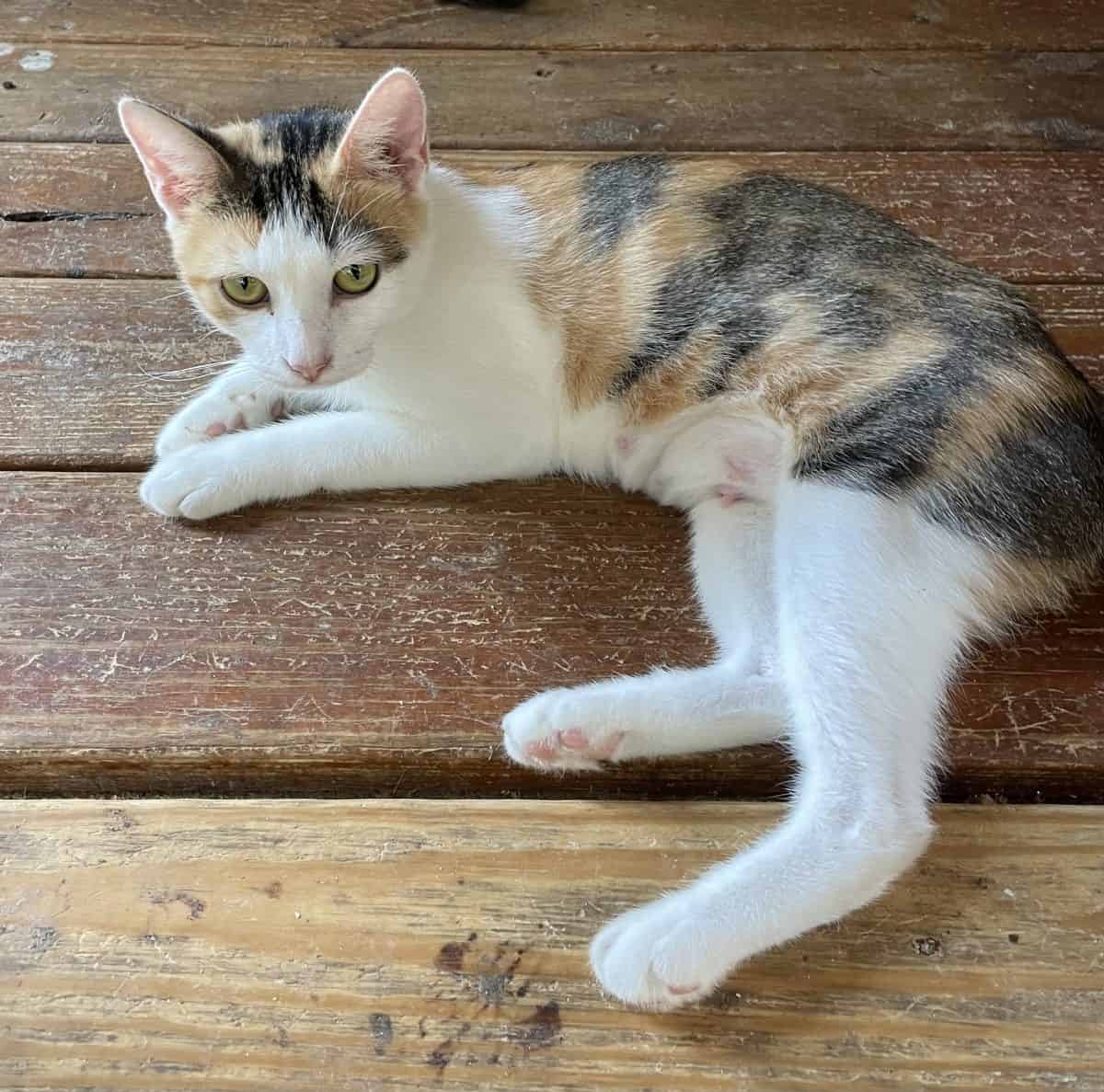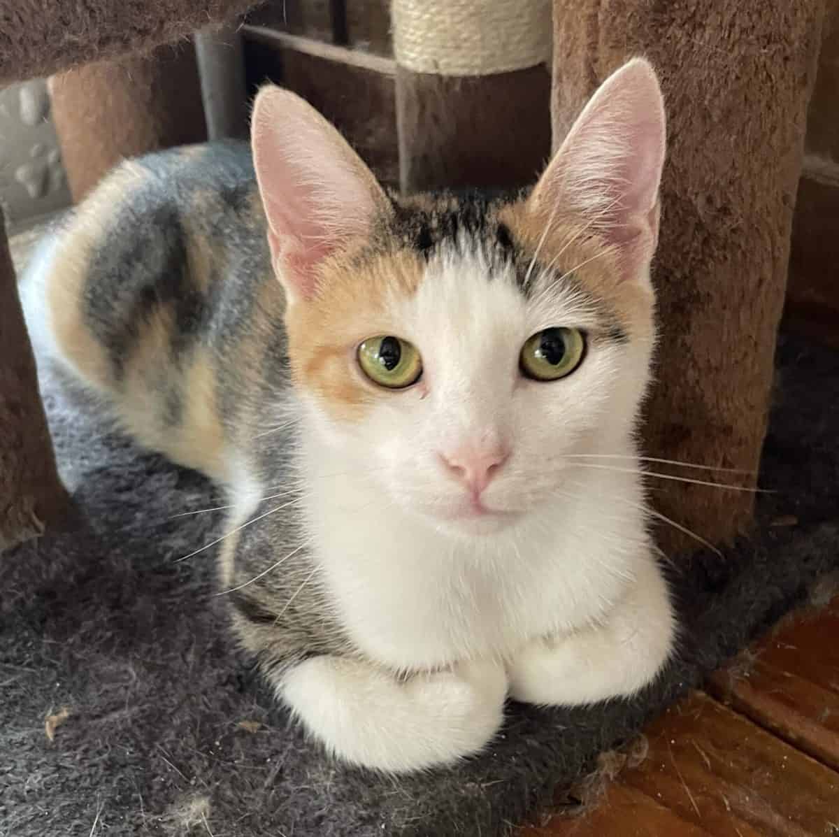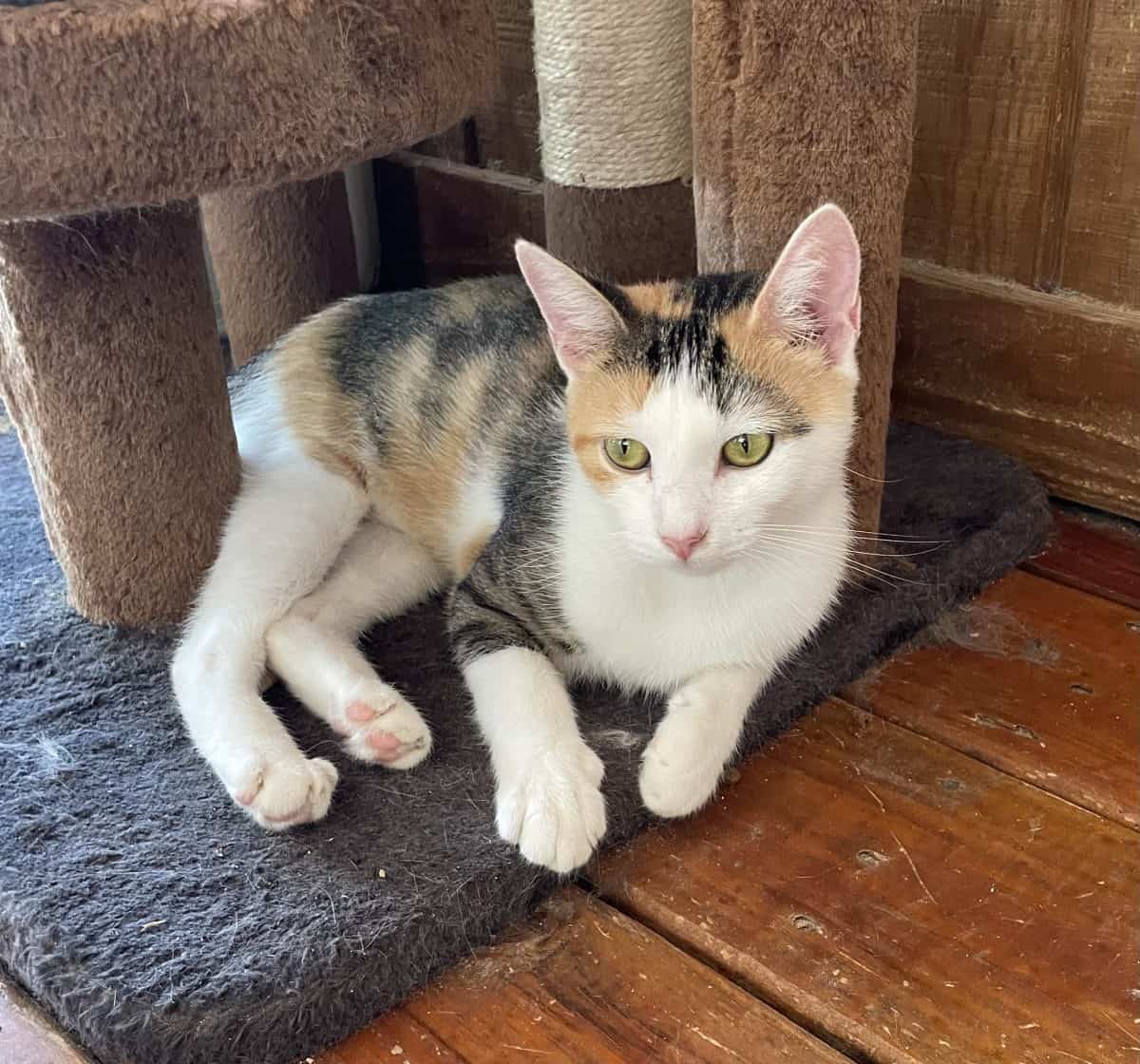 Sassy is very friendly, affectionate and quite chatty. We believe she’s about 2 years old.