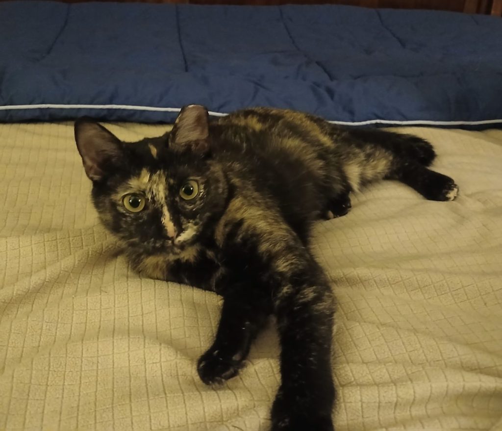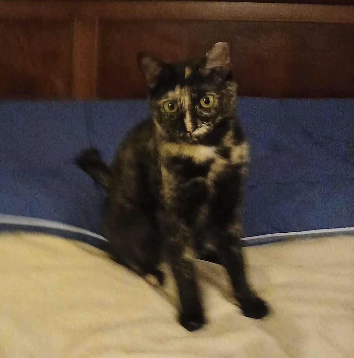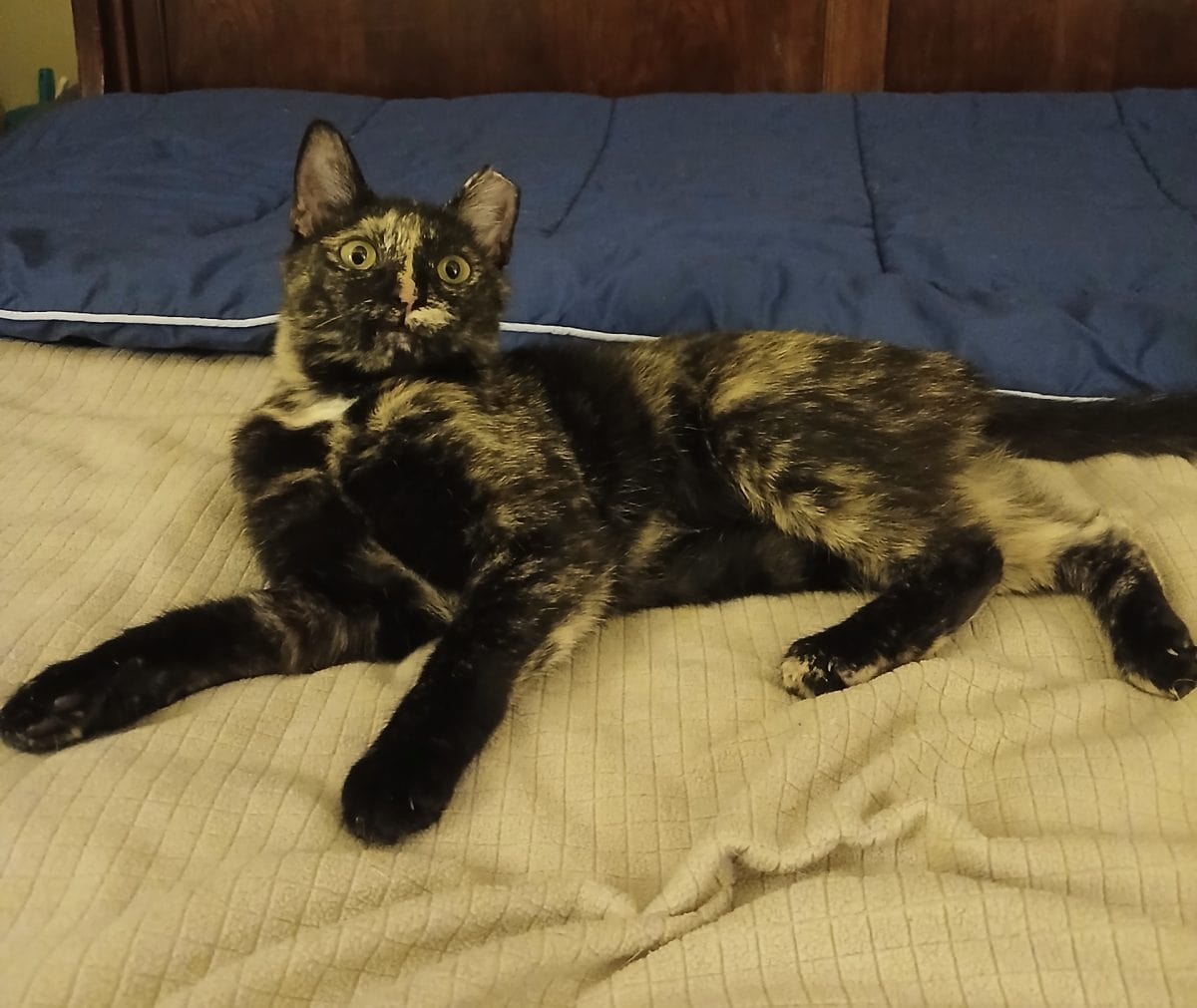 Stormy is a beautiful tortoiseshell girl who was found surviving outside. She was very shy when first rescued and has come a long way. Stormy will still need someone to give her time to adjust and continue her socialization. She is 7 months old, very playful, good with other cats and dogs, She purrs a ton. Stormy loves to have her head scratched, and sleeps on her Foster’s bed at night.
