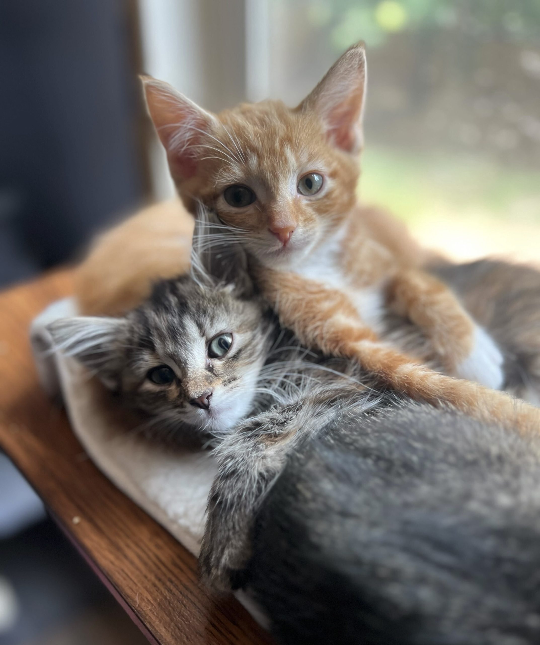 If you’re looking to adopt two kittens, his sister Penelope (calico) would be a great choice!